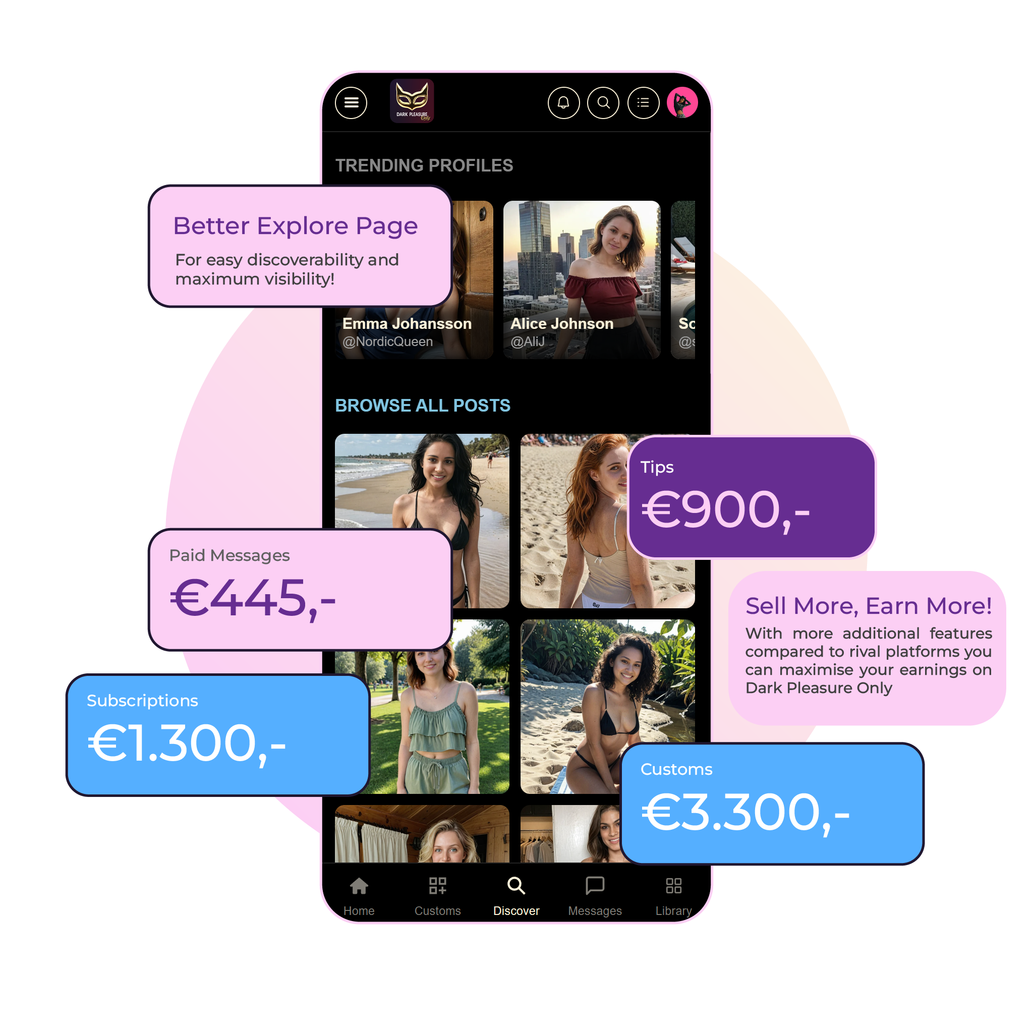 Dark Pleasure Only is a new upcoming app for creators to make their money online. Featuring a unique and rich featureset to maximise your profits.